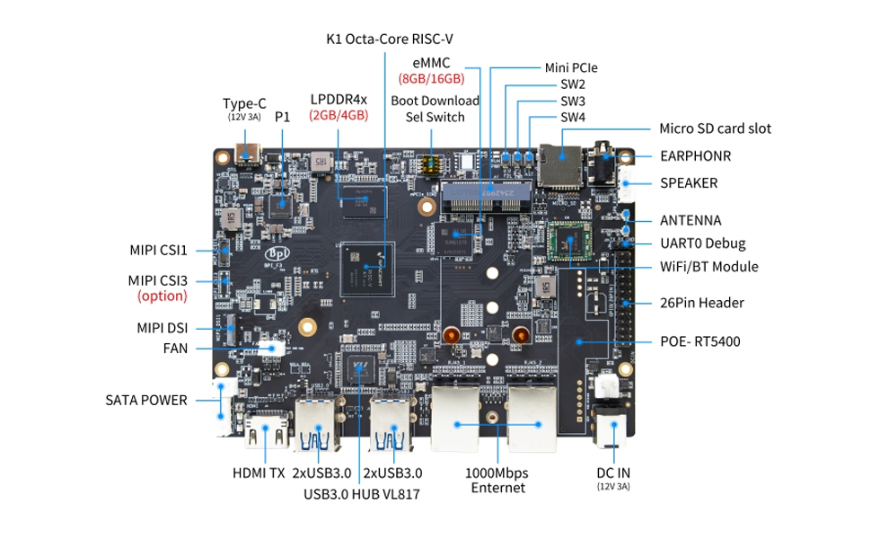 websiteBanana Pi BPI-F3: Powered by the SpacemiT K1 (an 8-core RISC-V SoC), this board is designed for high-performance computing, supporting RVA22 and RVV 1.0.